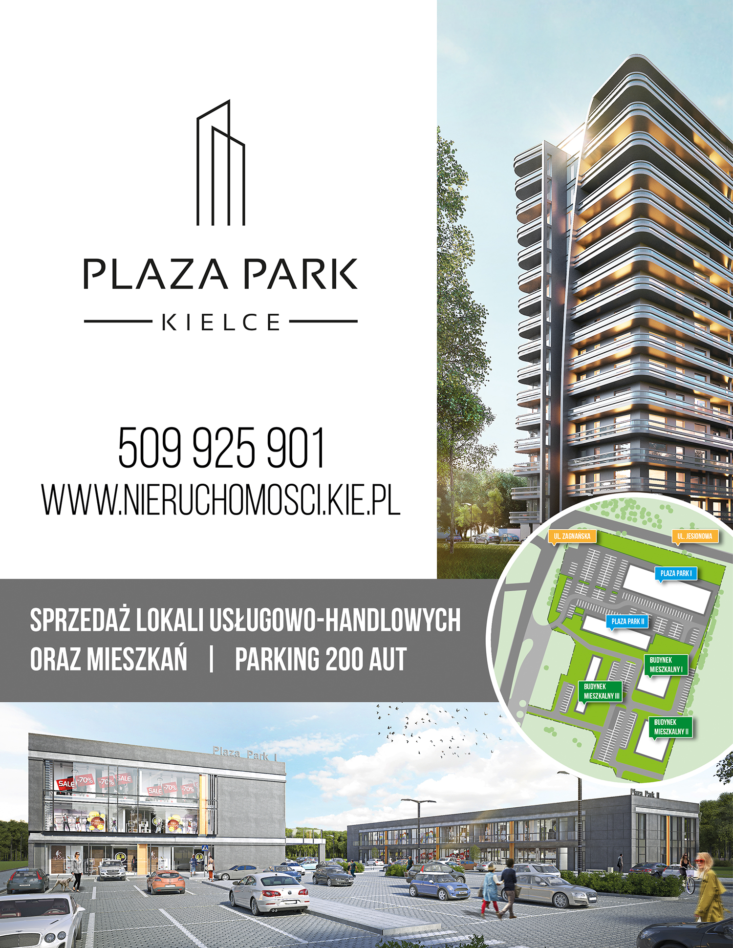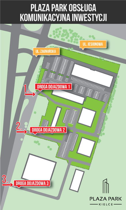 PLAZA PARK KIELCE Plaza Park to wielofunkcyjna inwestycja, która powstaje u zbiegu ulicy Zagnańskiej i Jesionowej. Na ponad 2,5 hektarowej działce już wkrótce zakończy się budowa 2 pawilonów usługowych z parkingiem na ok. 200 aut. Dzięki nim mieszkańcy tego rejonu miasta będą mieli zapewniony bezpośredni dostęp do oferty usługowo-handlowej. Zabudowa usługowa zapewni także odpowiednią ochronę akustyczną. Na terenie położonym bliżej doliny Silnicy już na wiosnę rozpocznie się budowa pierwszego budynku mieszkalnego. LOKALNE CENTRUM USŁUGOWE Większość powierzchni usługowo-handlowych znalazła już swoich nabywców. W tej części swoją działalność rozwiną znane kieleckie firmy, m.in. PSS SPOŁEM oraz MAXIPIZZA, która zaprezentuje swój gastronomiczny koncept w zupełnie nowej odsłonie. Swoją działalność będą prowadzić także: Szkoła Języka Angielskiego ENGLISH TEAM, salon z podłogami KREZUS, cukiernia KALINKA. Pojawi się także bogata oferta usług medycznych: LIFEMED, MEDILENS, gabinet fizjoterapii, gabinet dietetyczny. Dzięki temu kielczanie zamieszkujący okolicę będą mieli dostęp do wielu potrzebnych usług zaledwie kilka minut spacerem od swoich bloków. W kwietniu 2019 r ruszy budowa PLAZA TOWER- nowoczesnych wysokich 16 piętrowych budynków.